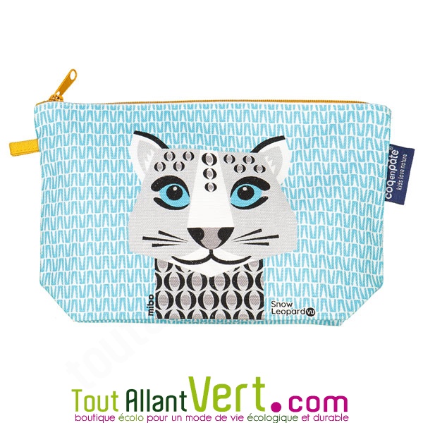 de Coq en PâteGrande trousse d'école pour ranger crayons et règle. 22 x 13cm avec un large soufflet de 6 cm. En coton biologique. Fond bleu clair avec un joli Léopard des neiges sur le devant. Marque Coq en Pâte.